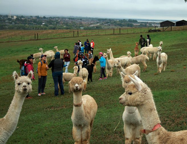Alpaca breeders love the attention…the alpacas themselves, not so much. Alpacas prefer peace and quite. Being at the center of attention generally concerns them. They do best with quite, gentle and consistent interactions. They are food motivated and love treats. Consequently, they are pretty easy to train. Be careful not to “over train” them to be too friendly and that proper boundaries are established when they interact with people and children. We get a lot of activity at our ranch and consequently have trained our alpacas not to be afraid of visitors. We also help our visitors learn not to be fearful of the alpacas. It’s always a gratifying to watch visitors and the alpacas connect.